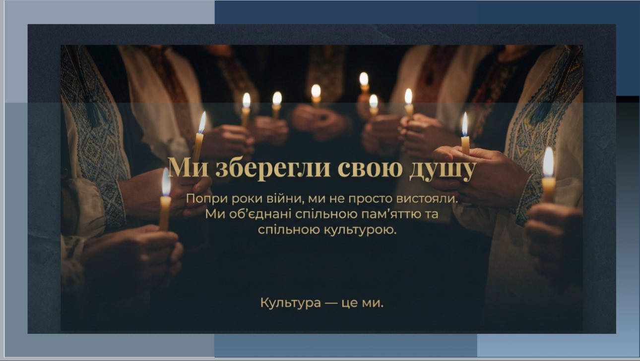 «Культура не має адреси. Її неможливо зруйнувати ракетами, бо вона живе в кожному українському слові, у кожній пісні й, насамперед, у наших серцях. Вона там, де ми. Вона — це ми».