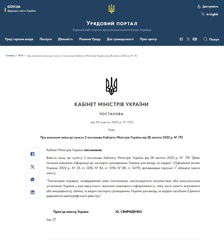 Міністерство закордонних справ України (МЗС) повідомляє: з 29 жовтня 2025 року в Україні скасовано тимчасовий режим продовження терміну дії закордонних паспортів громадян України для виїзду за кордон.